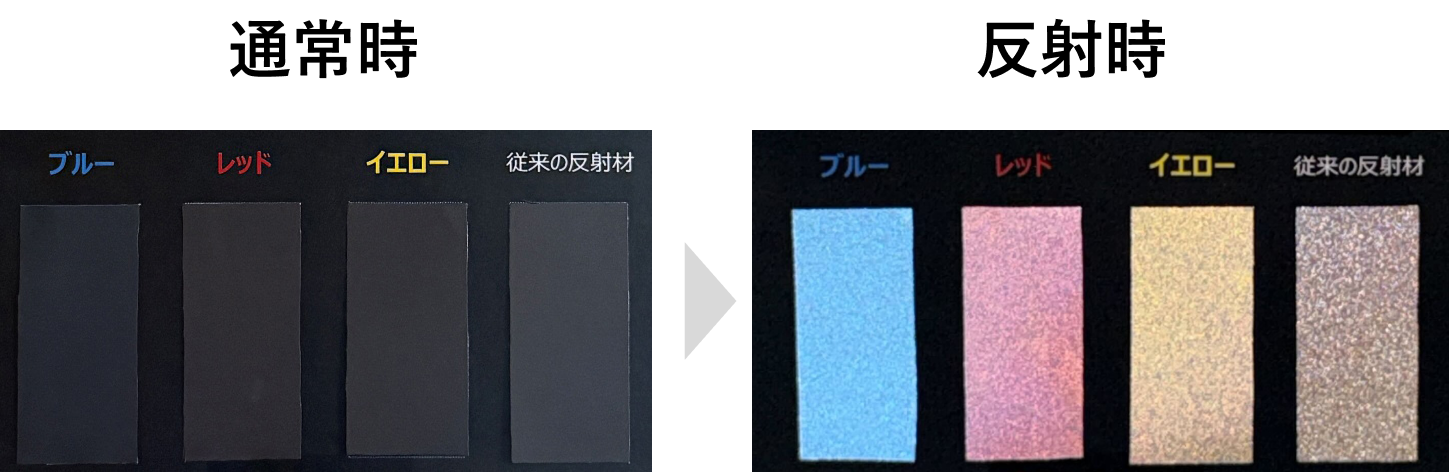 従来のColor Shine Plus製品のイメージを覆す、黒色のリフレクターです。通常時は黒色でダークトーンのベースに馴染みますが、暗闇での再帰反射時には一転、黄色・青・赤のいずれかに光る3色展開。「白いリフレクターでは通常時のデザインに馴染まない」「通常時は目立たず、暗闇では美しく光る驚きがほしい」といったデザイナーやクリエイターのニーズに応える新素材です。